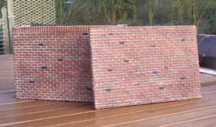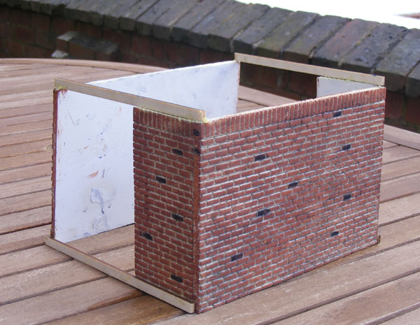After Exeter, I decided to make a start on the Loco Repair Shop. The walls for this were built from a sheet of Andel Models brickwork which was carefully cut to size outside (because cutting epoxy resin with ANY sort of saw creates a HELL of a lot of dust) followed by careful painting on the face of the bricks only with terracotta masonry paint, followed by painting odd bricks black and a wash over with very dilute black paint.
