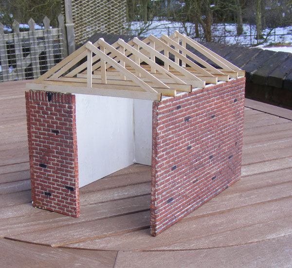 ................. and the latter glued to the former with 5 minute epoxy. Once this had gone off, the temporary beams were removed and the final two trusses glued into place. It was only after taking this picture that I noticed that the wall was leaning............... easily corrected by breaking the glue joints and re-sticking.