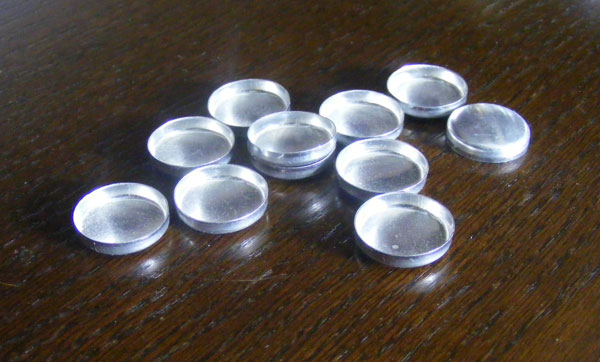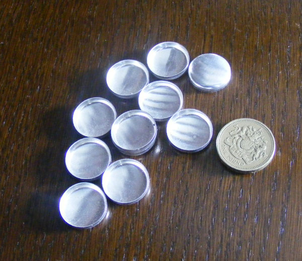 ................. with the reflectors being made of these upholstery button covers, scrounged from a furniture manufacturer in Long Eaton. The £1 coin give some idea of the size.