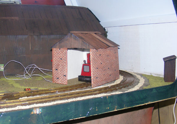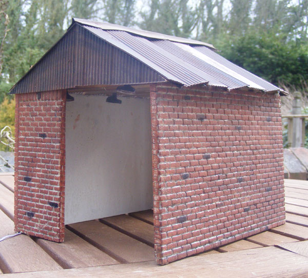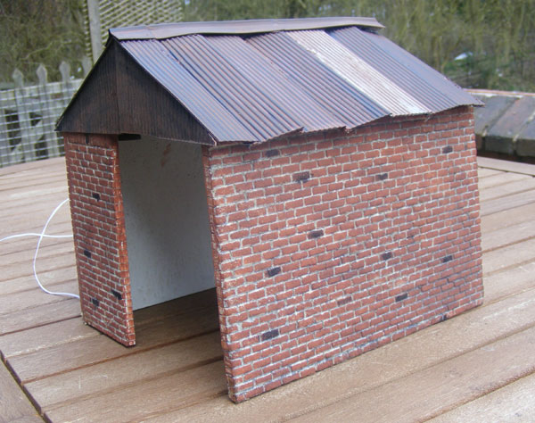 The next job was to glue the light fittings into place with hot glue gun glue, following which the roof panels (individual ones, this time) wre glued in place with the hot glue gun. A swift coat of dilute Track Colour, followed by a wipe off, and there we were!