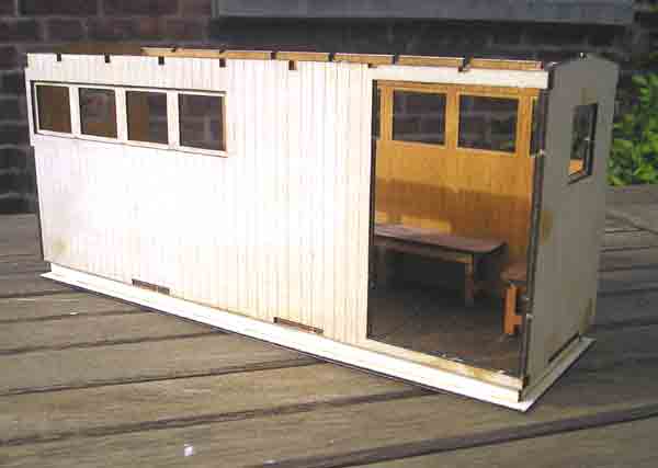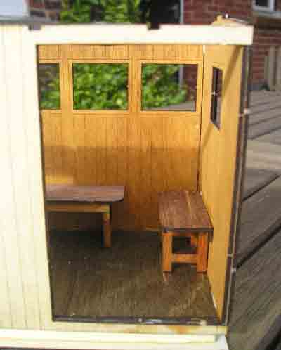 One decidedly odd feature is that the kit smells of burnt wood - hardly surprising, given the method of manufacture! This also puts a dark edge on all the cut edges, so a gentle rub with some glasspaper is needed if (like me) you want to stain them a light colour. Each part of the main body is made out of three separate layers of thin ply. It IS advisable to get yourself a couple of pieces of plate glass, so that all the main components come out flat. This picture shows how well the interior is detailed - both sides and floor (and the underside of the roof) have planking detail.